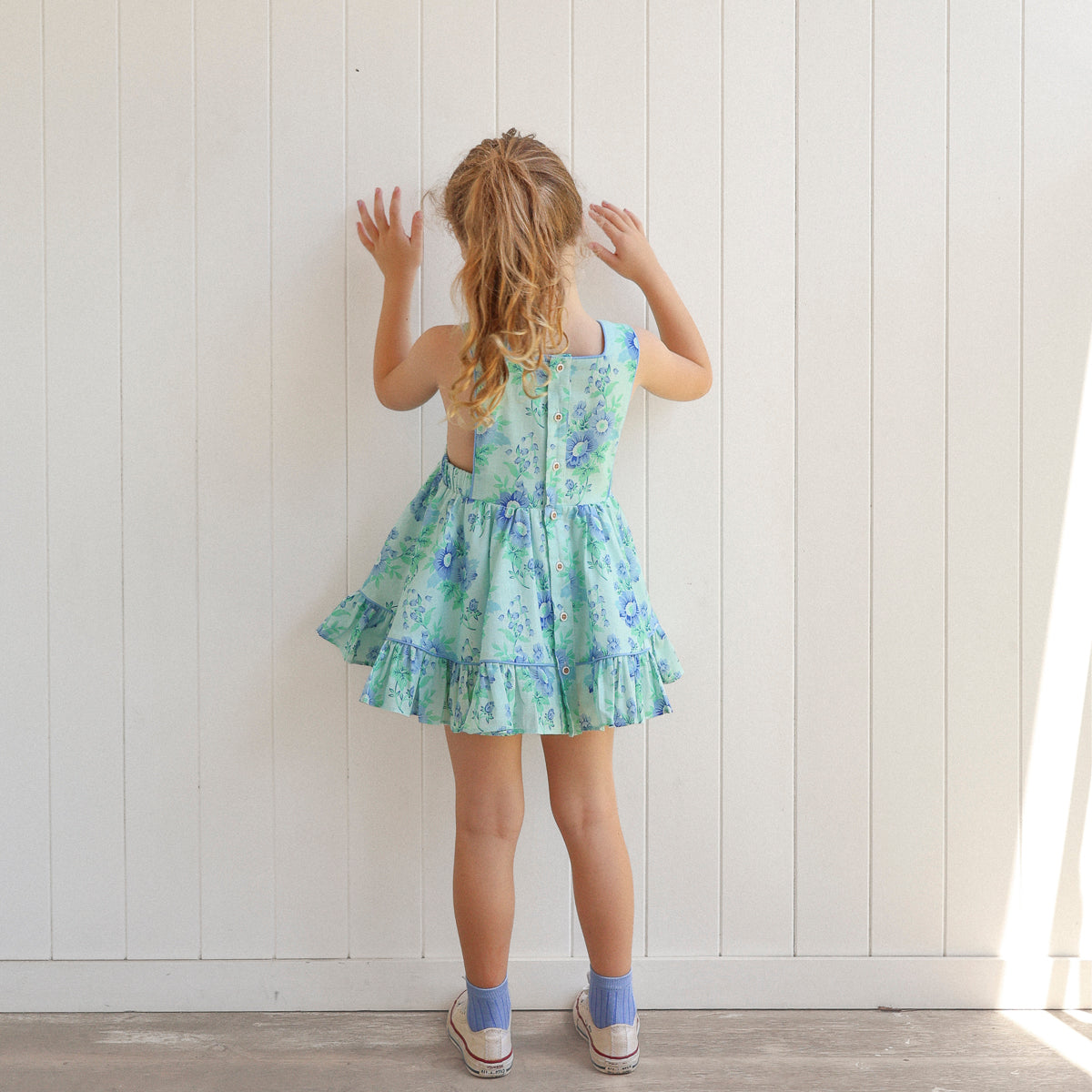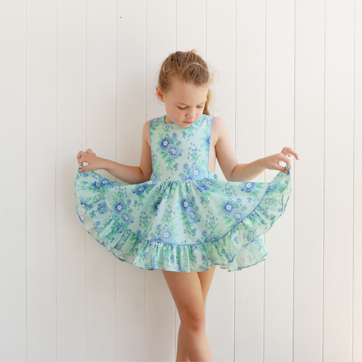 Named after our sweet Mads, this Pinny captures her sunshine spirit and old world charm. It features a floral print in shades of cornflower and sky blue with leafy green stems set against a pastel mint-blue base, inspired by vintage garden fabrics.